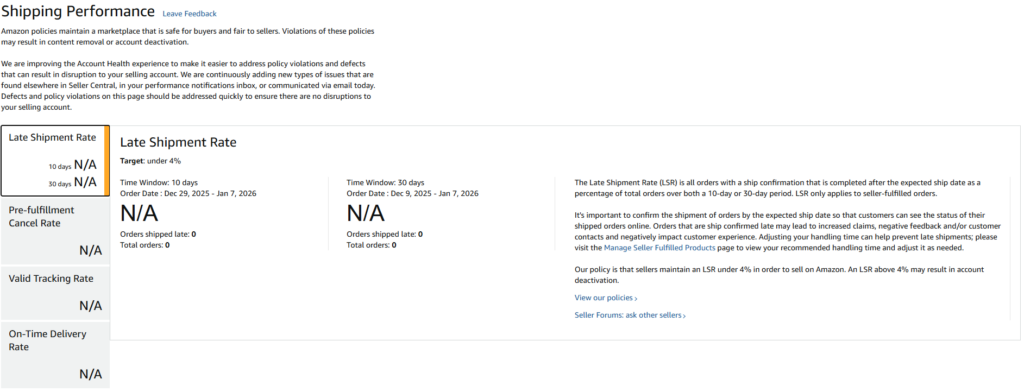 Check your Late Shipment Rate daily during high-volume periods and at minimum every other day during regular periods. Late shipments accumulate quickly and Amazon’s 4% threshold can be breached rapidly during busy seasons.