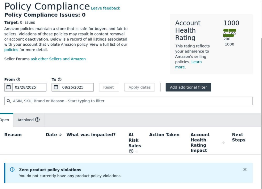 We recommend checking the Policy Compliance Report daily during your first month of monitoring, and for high-volume sellers with frequent catalog changes. Policy violations can appear suddenly and impact your best-selling products without warning.
