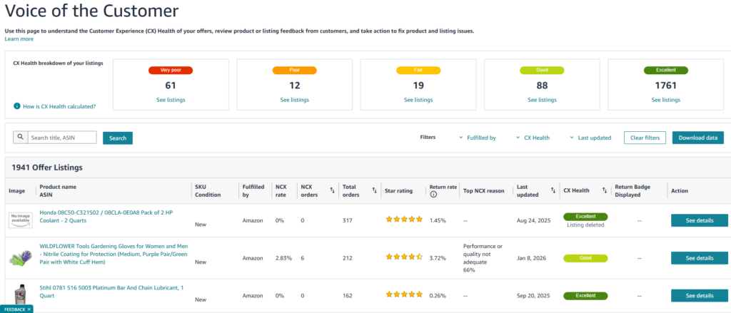 The Voice of the Customer Report provides complete visibility into Negative Customer Experiences (NCX) and product health metrics for every item in your catalog. This automated report captures customer satisfaction data including returns, negative reviews, feedback, and other quality indicators. Understanding these metrics is essential for maintaining high customer satisfaction, avoiding product suppression, and preventing High Return Rate ASIN (HRRA) penalties.